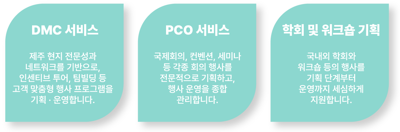 인센티브 투어, 국제회의, 학회 및 워크숍 등 다양한 MICE 행사의 기획 및 운영 서비스를 전문적으로 제공합니다.